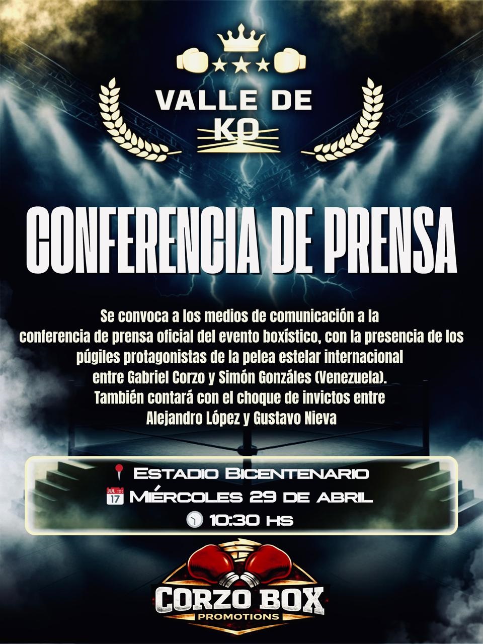 La promotora Corzo Box Promotions realizará este miércoles 29 de abril la conferencia de prensa oficial de la velada que promete ser una de las más atractivas del calendario local.